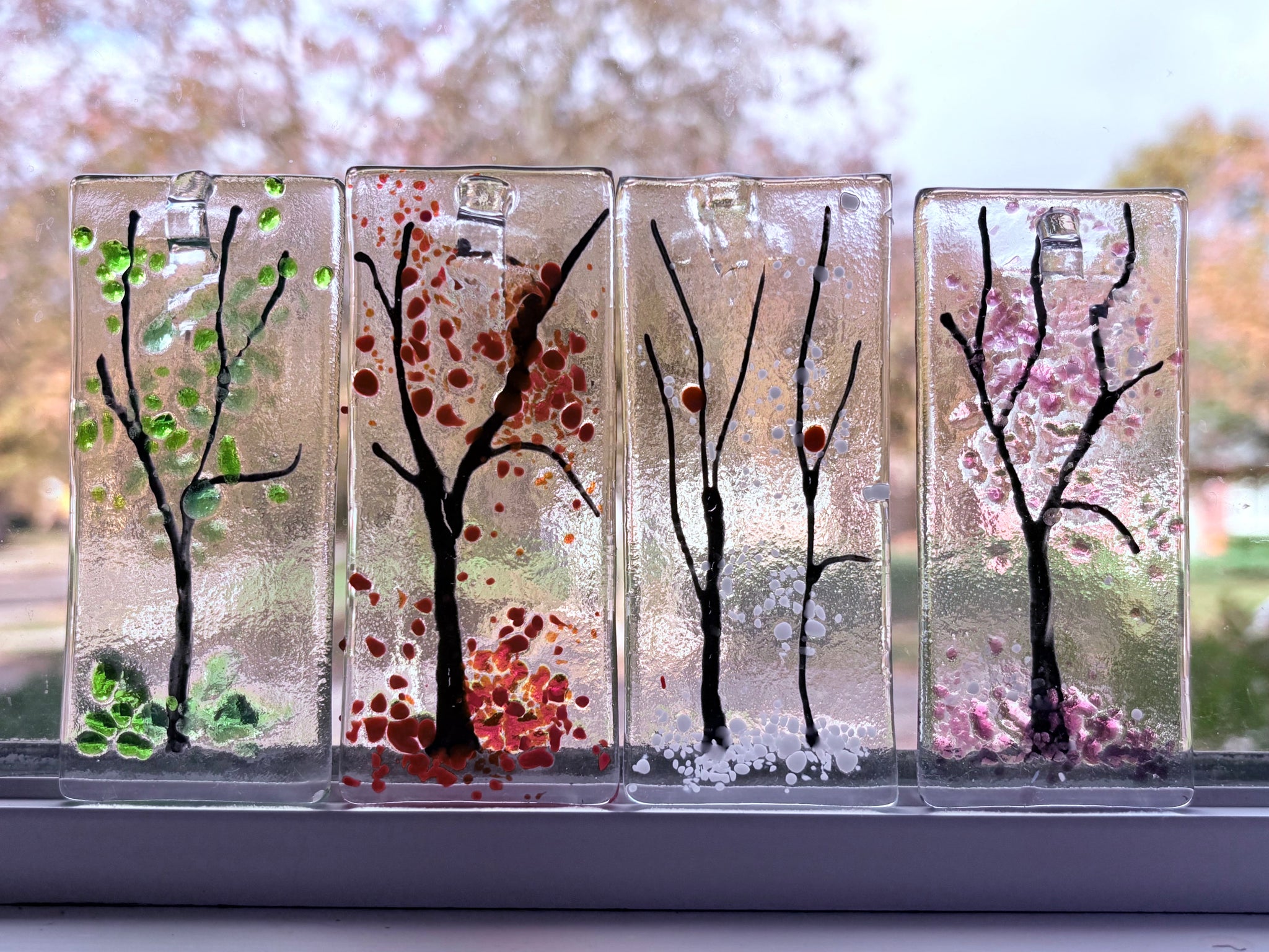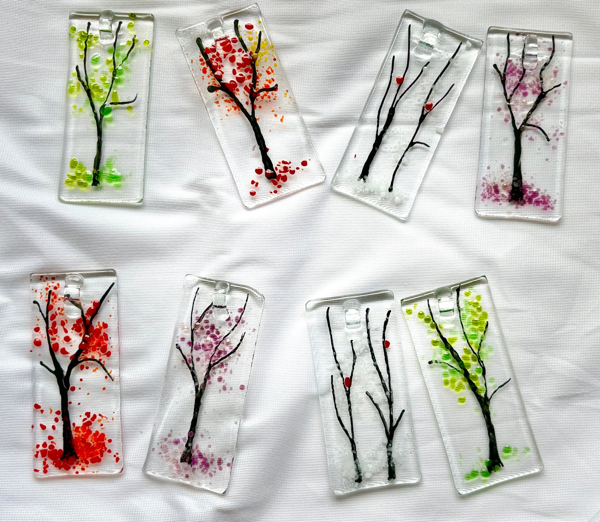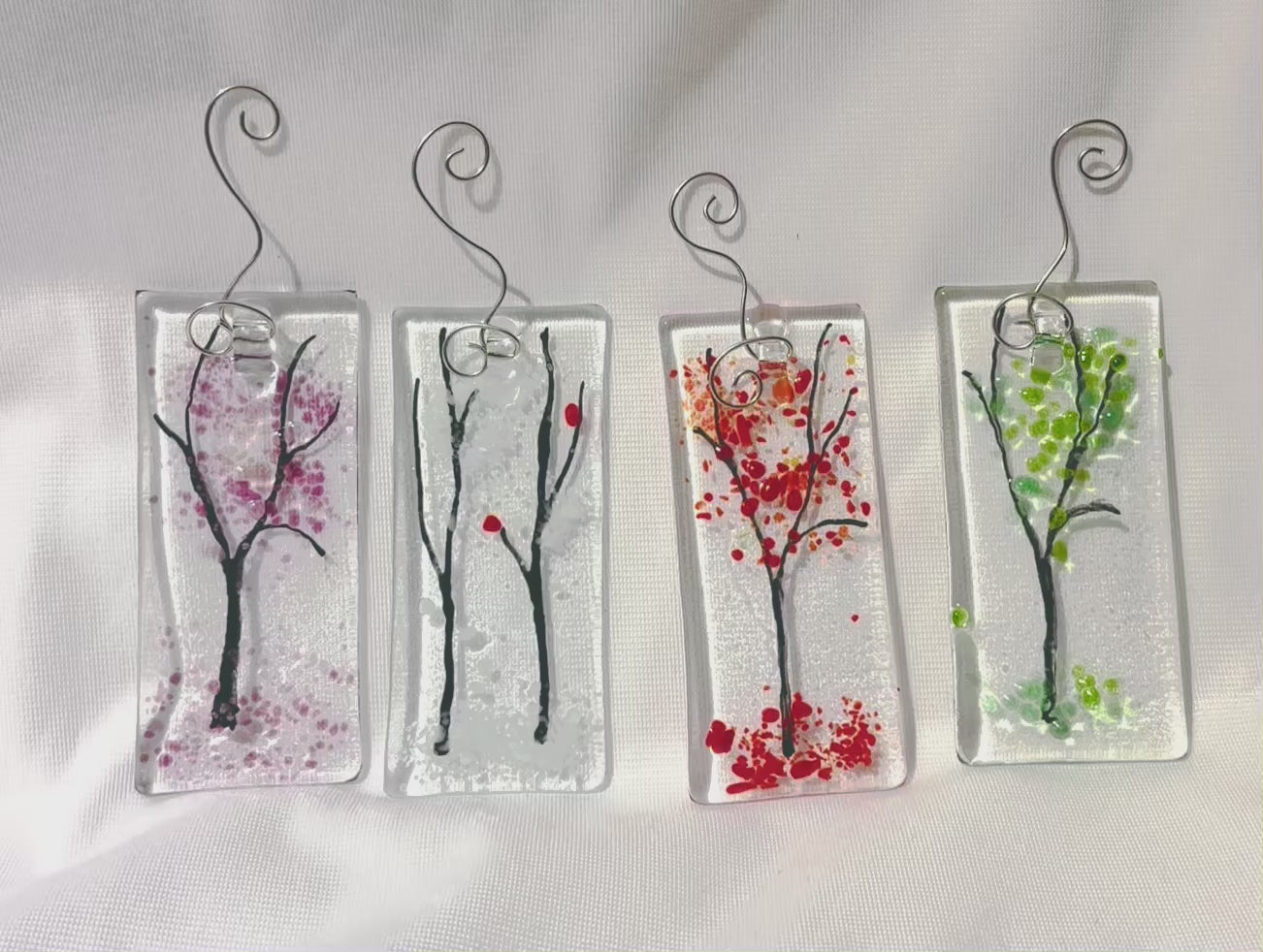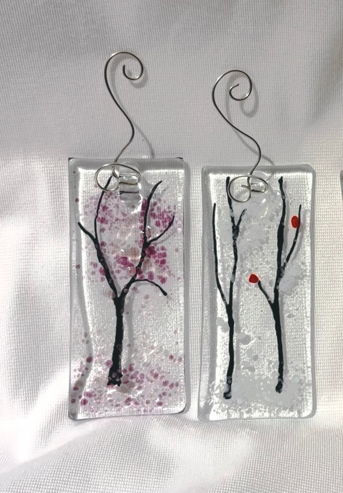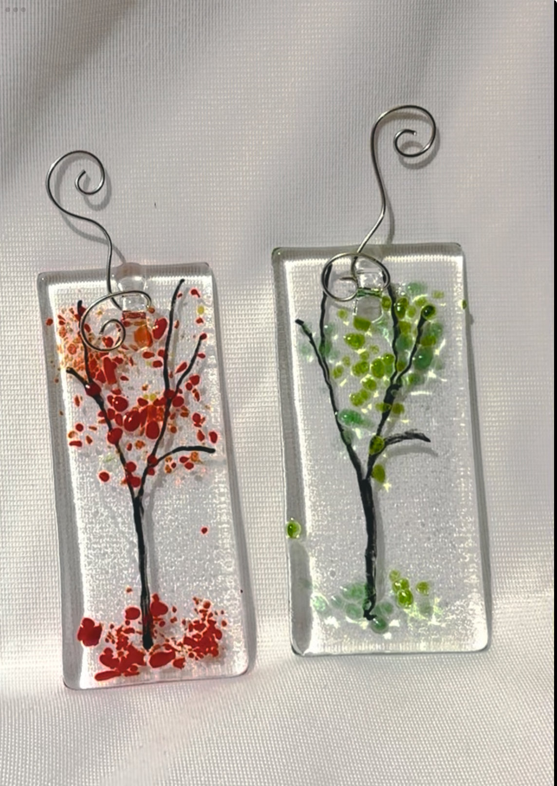 Kiln fired hand painted trees with tones of frit to demonstrate the beauty of the Canadian seasons. Each ornament is individually hand made by Kara.
